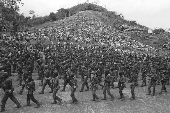 As night fell on Dec. 31, 1993, the armed forces of the EZLN had begun to gather. It was an army made up almost entirely of indigenous people, and about a third of the soldiers were women. As dawn broke on New Year’s Day, Zapatista troops occupied seven towns throughout the eastern half of Chiapas, including San Cristóbal de las Casas, a quaint colonial city nestled in the misty highlands of Chiapas and a major tourist destination. The Zapatistas occupied San Cristóbal for less than 48 hours. They stayed long enough to read their declaration of war from the balcony of the municipal palace, but slipped away in time to escape the full brunt of the Mexican military. The uprising would quickly transform the EZLN into one of the most well-known social movements in the world, and one that would inspire an extraordinary level of solidarity.
