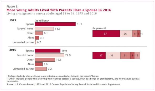 “There are now more young people living with their parents than in any other arrangement,” says the Census Bureau study.