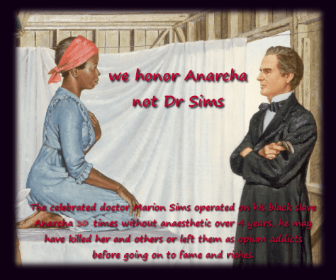 Dr Sims, who had no gynecological experience, obtained up to 20 black slave women suffering gynecological injuries of torn fistulas and experimented on them, without anesthetics , for 4 years in his ”medical Plantation” in Alabama .