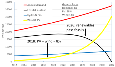 ¶ “Solar PV and wind are on track to replace all coal, oil and gas within two decades” • Solar PV and wind power are getting cheaper and more abundant so rapidly that they are on track to entirely supplant fossil fuels worldwide within two decades. The political voices saying Australia needs new coal stations sound rather quaint. [The Conversation AU]