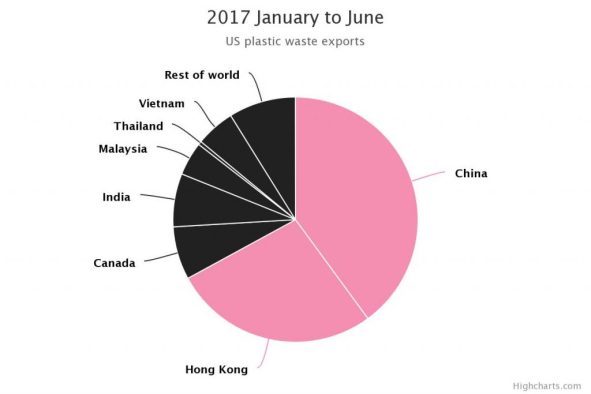 - Despite the China ban, Asia remains the main destination for American waste exports. In the first six months of this year, 81% of plastic waste exports from the US went to Asia, a 7% drop on 2017.