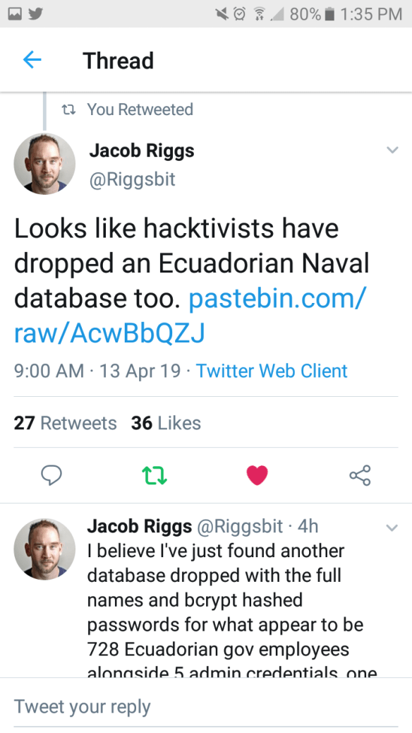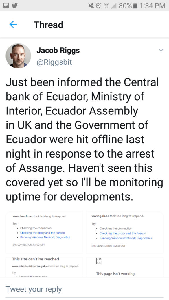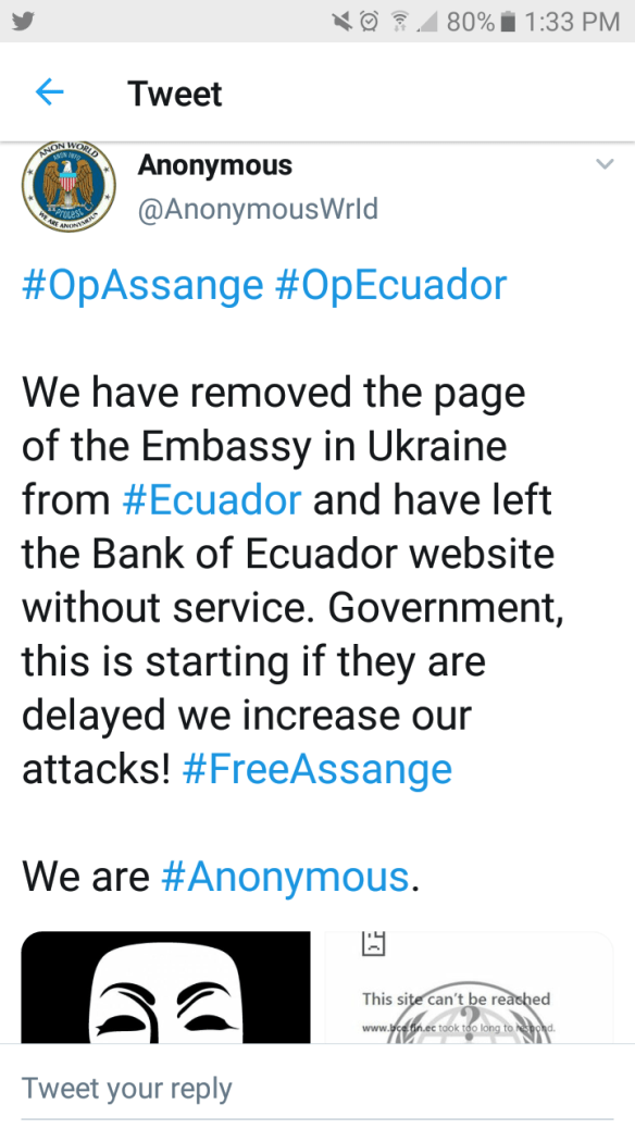 Breaking News: The group called anonymous is taking down Ecuador in a move for their illegal eviction of Assange. Rumor had it Assange had a “panIc button” if he was taken that would take down Ecuador. Little did they know the panic button was Anonymous. Sources say the book he was holding may have been the trigger and his yelling #UKResist may have been him pulling the trigger. Regardles it has just begun.