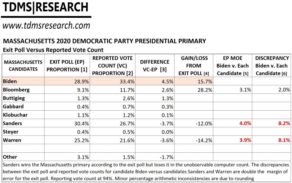 The 2020 Massachusetts Democratic Party presidential primary was held on March 3, 2020. Election results from the computerized vote counts differed significantly from the results projected by the exit poll conducted by Edison Research and published by CNN at poll’s closing. As in the 2016 Massachusetts primary between candidates Sanders and Clinton, disparities greatly exceed the exit poll’s margin of error. Sanders won Massachusetts in the exit poll and lost it in the computer count.