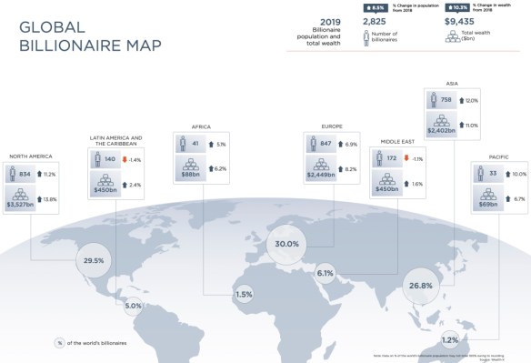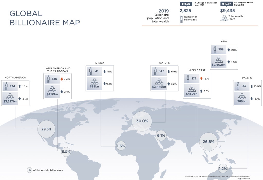 According to Wealth-X, which claims to “have developed the world’s most extensive collection of records on wealthy individuals and produce unparalleled data analysis to help our clients uncover, understand, and engage their target audience, as well as mitigate risk,” the size of the global billionaire population increased strongly in 2019, rising by 8.5 percent