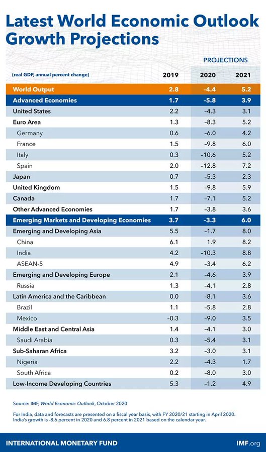 “We continue to project a deep recession in 2020. Global growth is projected to be -4.4 percent… In 2021 growth is projected to rebound to 5.2 percent, -0.2 percent below our June projection,” the WEO states.