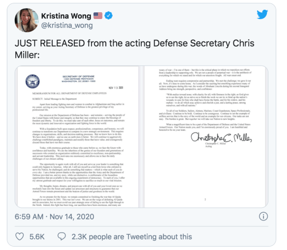 The letter came just four days after President Donald Trump fired Defense Secretary Mark Esper and replaced him with Miller, who was previously director of the National Counterterrorism Center. Miller was among four Trump loyalists who replaced top civilian officials at the Pentagon on Monday, just two…