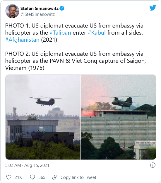 “The Taliban is not the south — the North Vietnamese army. They’re not — they’re not remotely comparable in terms of capability. There’s going to be no circumstance where you see people being lifted off the roof of a embassy in the — of the United States from Afghanistan. It is not at all comparable,” Biden stressed.