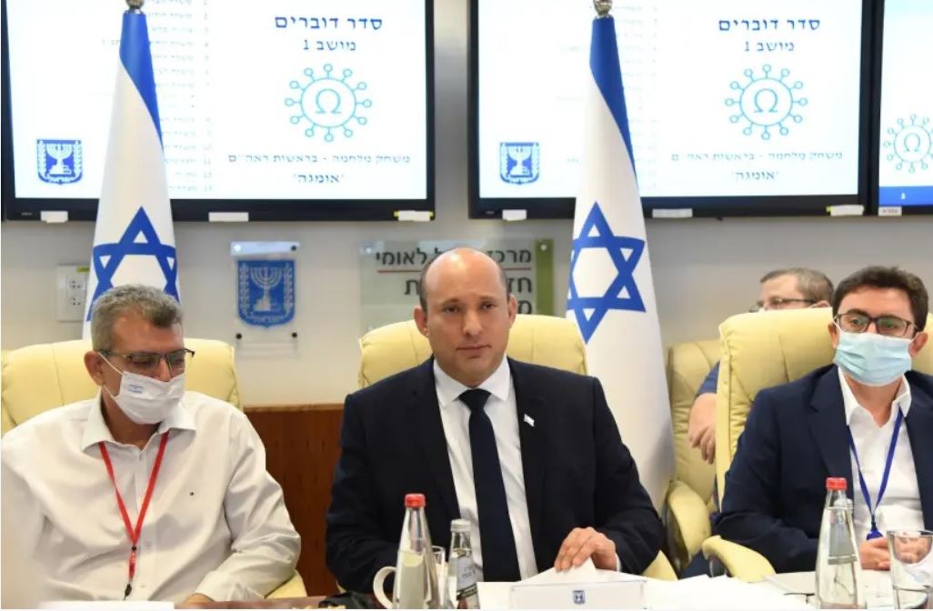 Israel’s Prime Minister Naftali Bennett is seen following the completion of the COVID-19 ‘war games’ exercise. Source.