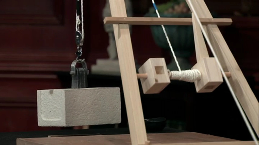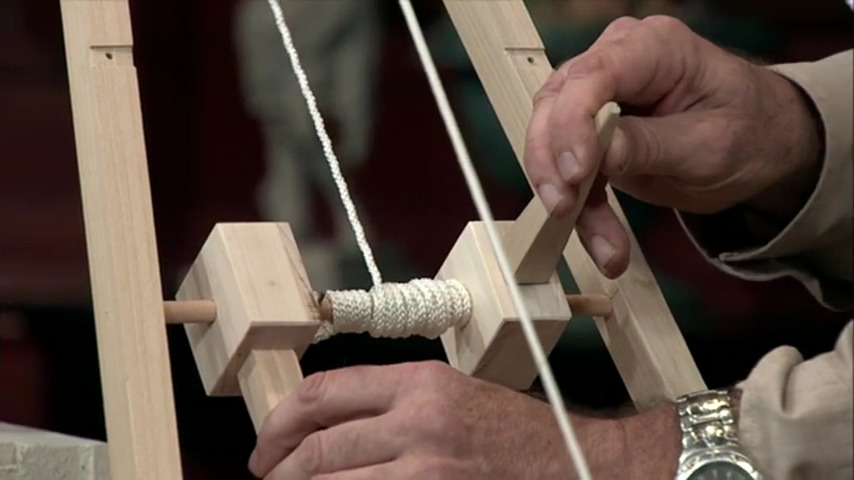 The sheer leg crane consists of two posts in an inverted V supported by two backstay ropes. A windlass is used to operate the lifting rope. The latter combines two simple machines: the shaft is a wheel and axle, while the hand spikes used to turn it are levers.**