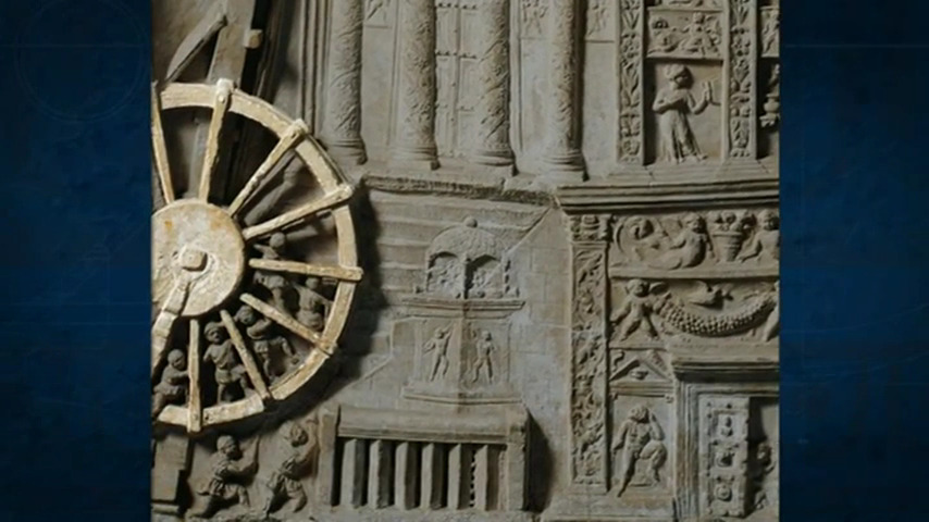 A classical era sculpture discovered in Germany depicts five men powering a treadwheel by walking inside it.