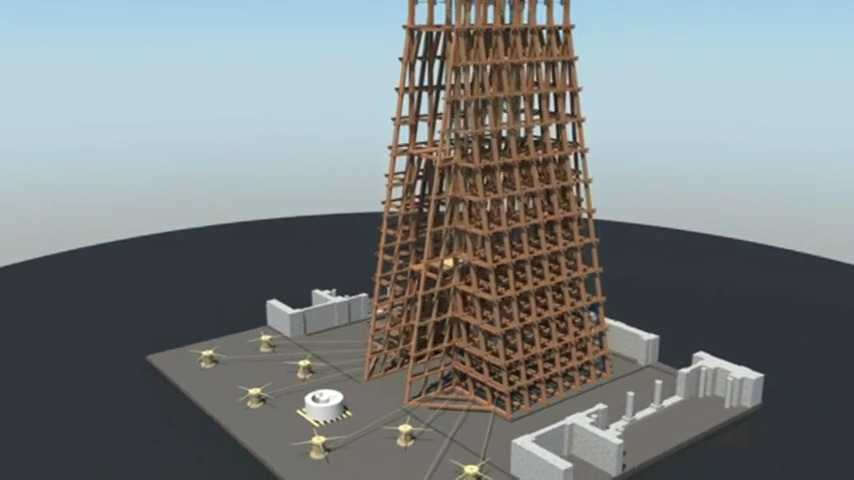 Archeologist Lynne Lancaster has created a reconstruction of the temporary wooden scaffolds she believes were used to construct the tower. The scaffolds supported two parallel shafts, one to lift the marble blocks and the other to lower them into position.
