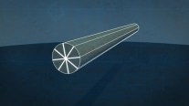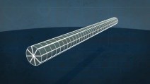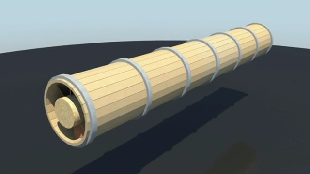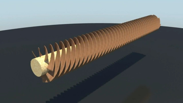 Starting with a wooden dowel, you draw lines dividing it into eight equal pie shapes. After dividing its surface into equal squares, you wrap a narrow strip of wood around the dowel at a 45 degree angle to the squares. The process is repeated seven times, adding additional veins for each of the points on the grid, until the helix is half the diameter of the dowel. Then you encase the entire structure with wooden slats held together with iron bands (like a barrel).