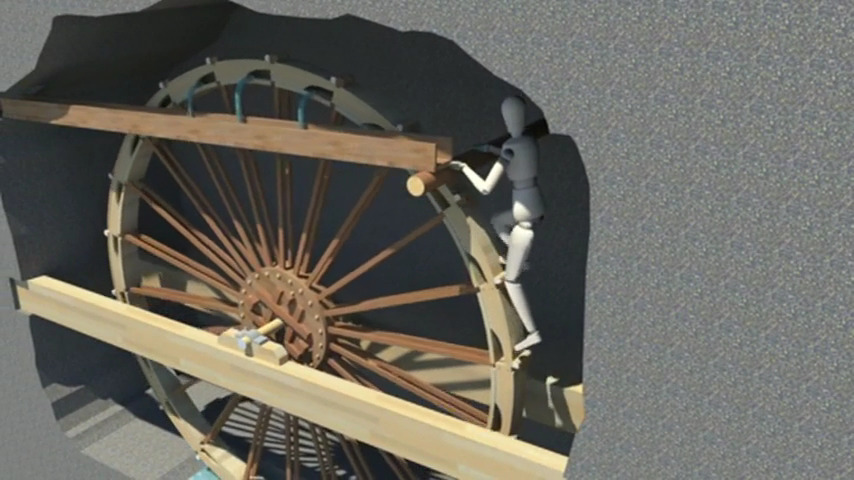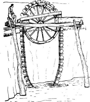 It was powered by a slave treading the outer surface of the wheel. A 10 foot diameter wheel could produce 5,000 gallons of continuous flow water in an hour.