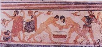 Tombs of Etruscan elites are decorated with detailed carved depictions of their burial ceremonies. In addition to lying in state and funeral processions, these often involved athletic games, dancers, sacrifices and community-wide ritual meals.