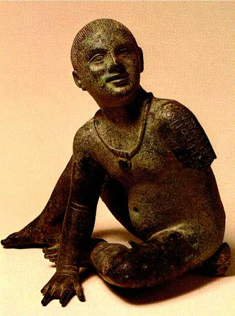 Etruscan divination is based on the belief that ll the gods, nymphs and demons overseeing human activity require appeasement. According to Etruscan myth, Tages* (an infant who popped out of the ground while the farmer Tarchan was plowing) provided the original instructions for successful divination. Tarchan would become the first Etruscan priest capable of reading entrails.