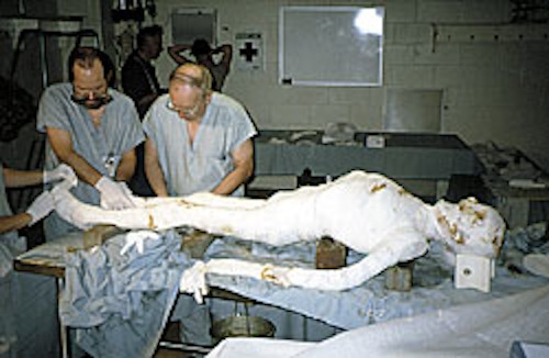 The natron they used to dehydrate the corpse (for the 36 days recommended in Rhind Bengreal Papyri – see Egyptian Mummification: The Historical Record) from Wadi El Natrun in northern Egypt.* They obtained the frankincense and myrrh from Yemen and Sudan via a Cairo street market. Placing the body in an indoor tent heated to 105 degrees F, they covered it with 600 pounds of natron. After 36 days, their corpse had lost half its body weight, though there was still evidence of moisture in the larger muscle groups. After leaving it in the natron another 25 days, it was totally dehydrated.
