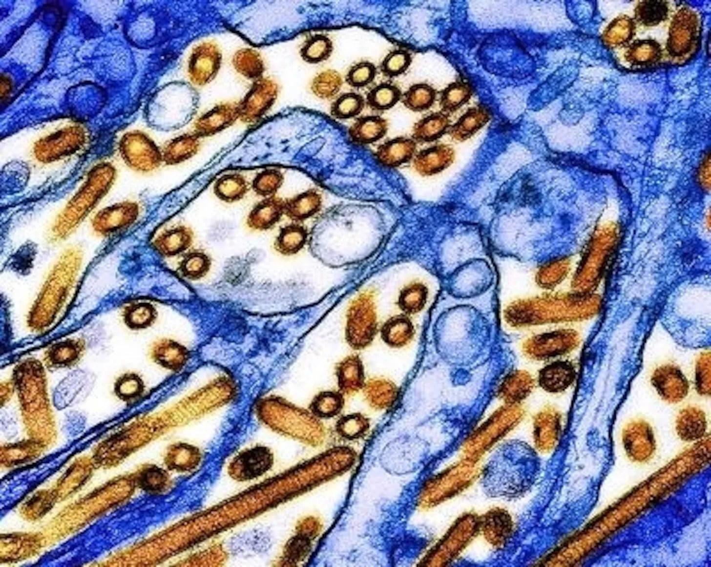 Colorized transmission electron micrograph of avian influenza A H5N1 virus particles (yellow/red)
