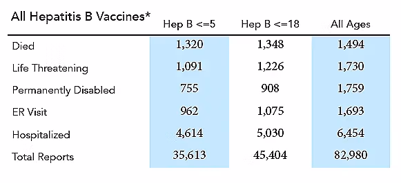 Hepatitis B is a component in many combination vaccines including Twinrix, Pediarix, and Vaxelis. When one looks at VAERS reports in the US for all vaccines containing a hepatitis B component there are 1,320 deaths in children age 5 and younger and 82,980 total reports of harm across all ages.