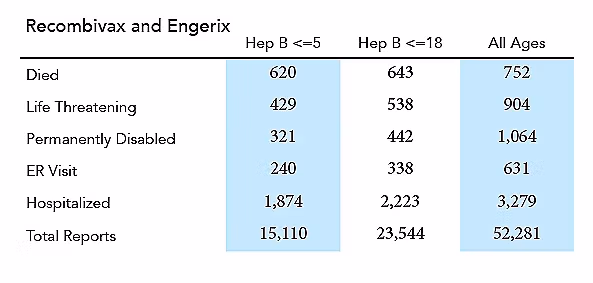 Just looking at Recombivax and Engerix, US reports, in children age 5 and younger, there are 620 deaths and 15,110 total injuries. There are 52,281 total reports of injury in the US across all ages for Recombivax and Engerix.