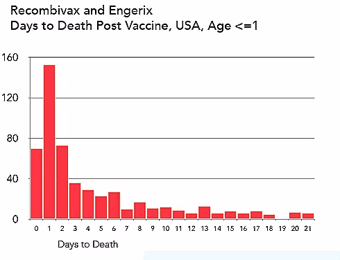 OpenVAERS also calculated the “days to death post vaccine” for all VAERS reports of death associated with hepatitis B containing vaccines and for Recombivax and Engerix. There we have a causal smoking gun as the largest numbers of deaths are on the day of vaccination or one or two days after.