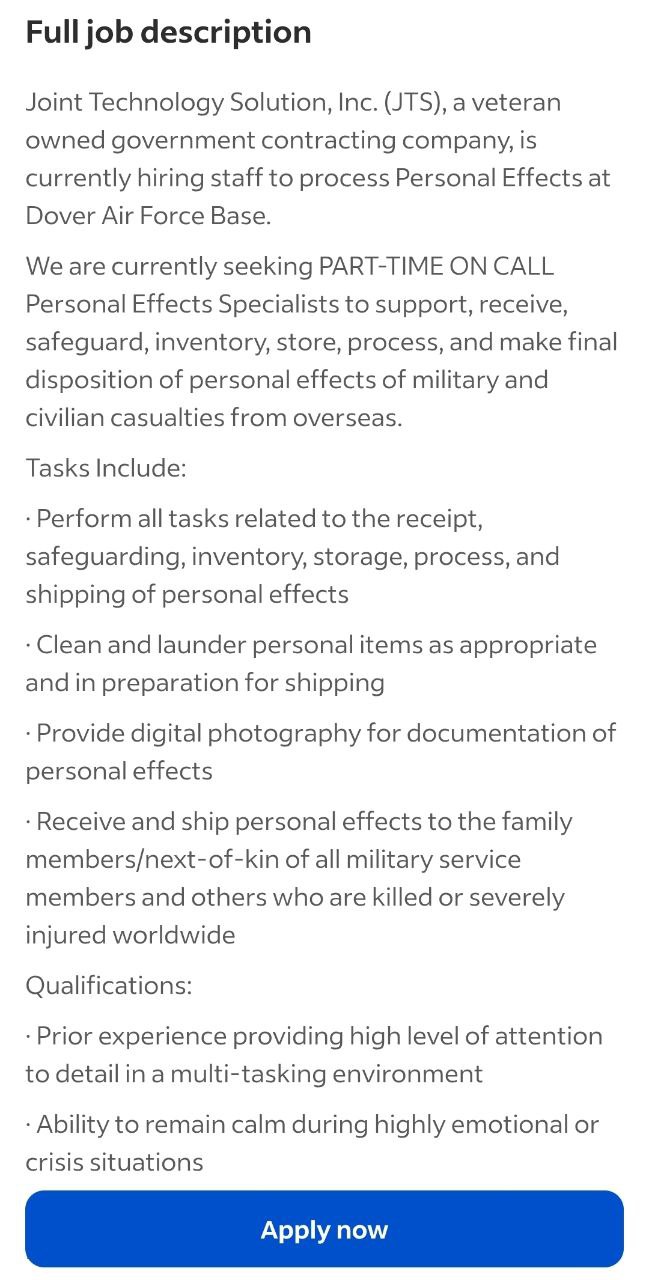πΊπΈ BREAKING! The United States has begun urgently hiring personnel at Dover Air Force Base to sort through the personal belongings of fallen soldiers.